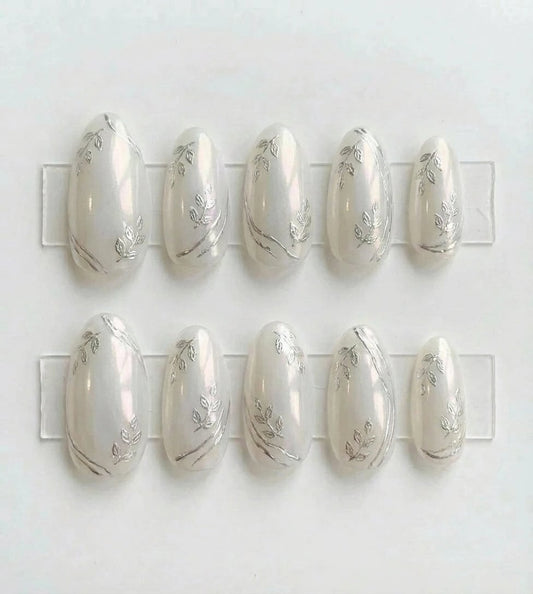White Pearl Cat Eye Press On Nails with Silver Leaf - Bridal Pearl Nails - Handmade Glossy Gel Nails - Elegant Wedding Press On Set - Custom Size Set - PN251120