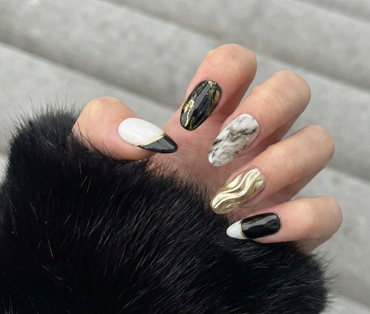 Black and White Marble Press On Nails - 3D Gold Chrome Liquid Metal - Abstract Foil Art - Modern Color Block - Custom Size Set - PN251220