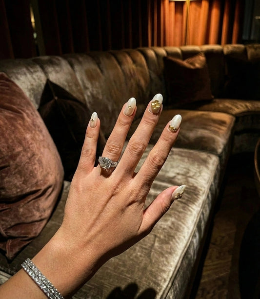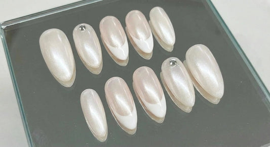 Pearl White Chrome Press On Nails - Bridal Nails with Rhinestones - Engagement Luxury Old Money Look - Custom Size Set - NM233011