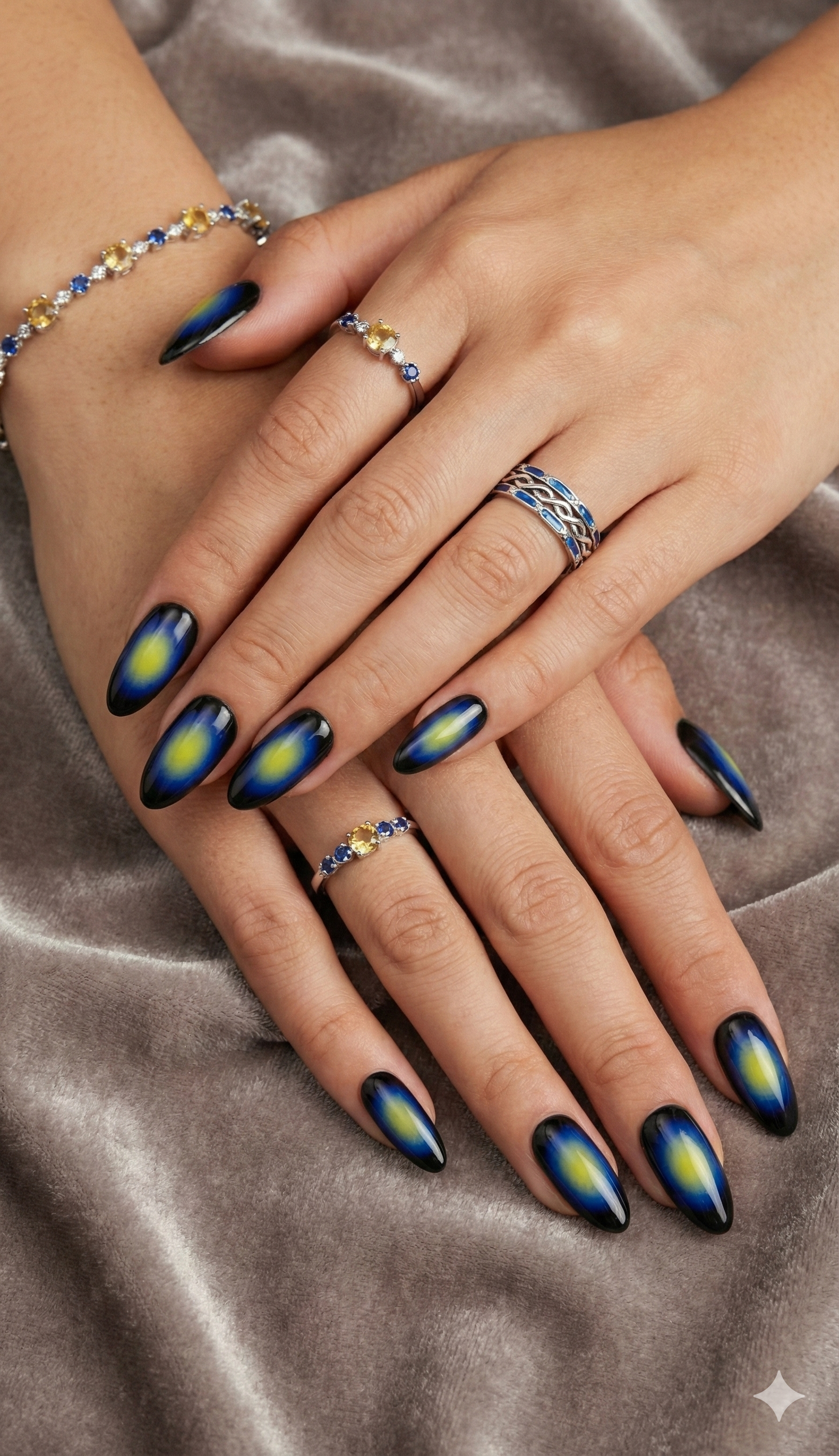 This edgy, trend-setting design features the viral "Aura" airbrushed effect, creating a glowing, psychedelic look right at your fingertips. The design starts with a deep midnight black/navy edge, fading into a vibrant royal blue, and bursting into a neon lemon-yellow center. This high-contrast gradient mimics the look of a thermal heat map or a spiritual energy field.