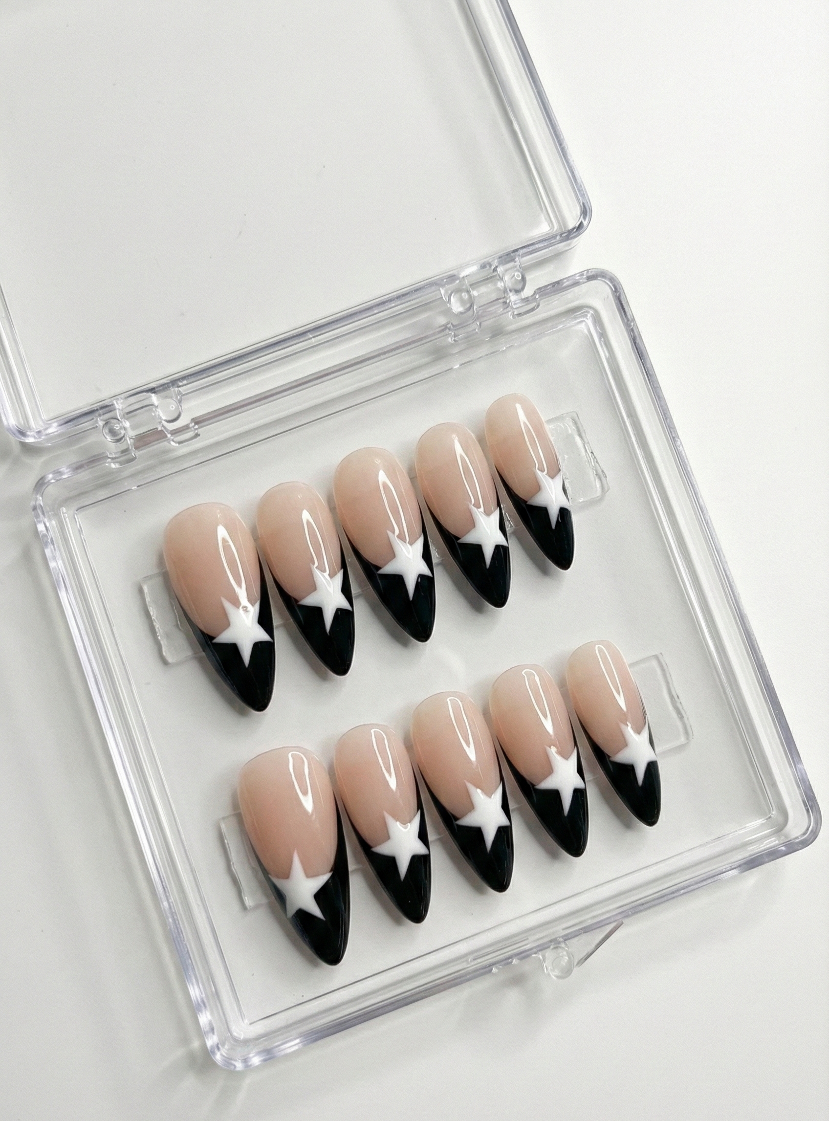 Channel the ultimate "Star Girl" vibe with the "Midnight Superstar" Graphic Set. This design puts a bold, rebellious twist on the classic French manicure, perfect for the modern trendsetter.