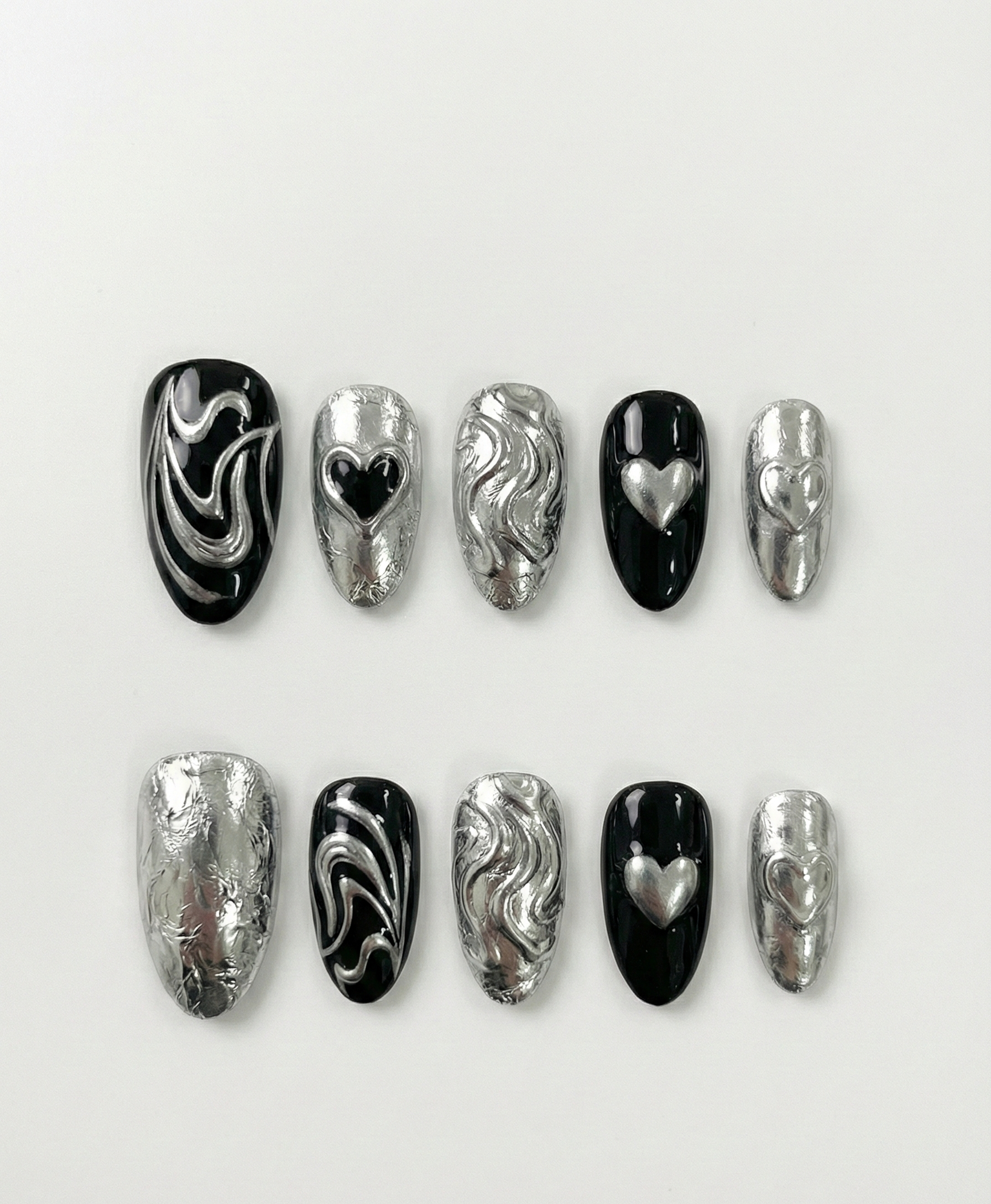 Black & Silver Chrome Press On Nails - 3D Liquid Metal Swirls - Textured Foil Heart - Cyber Sigilism Y2K - Grunge Punk Unisex Gel - Custom Size Set - PN251180