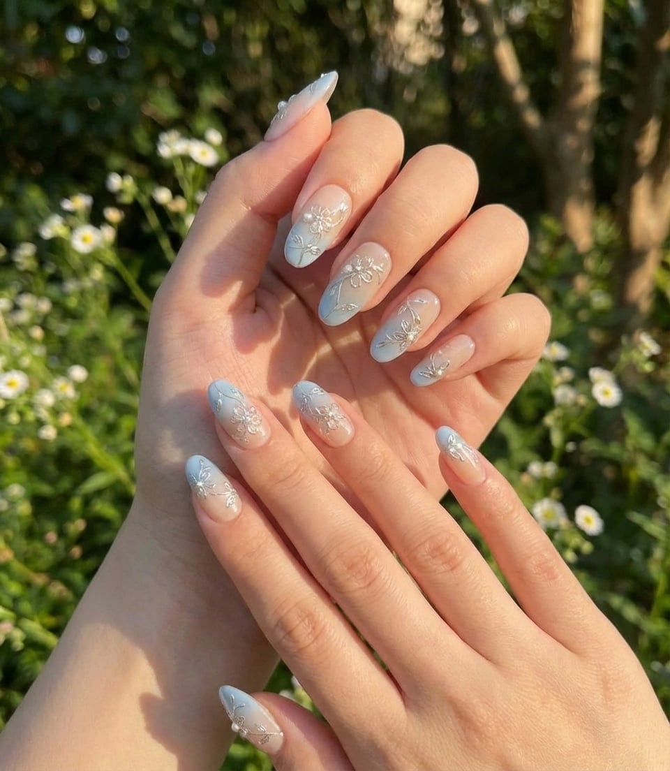 The subtle blue ombré combined with raised floral detailing creates a Korean-inspired aesthetic—clean, romantic, and effortlessly luxurious.