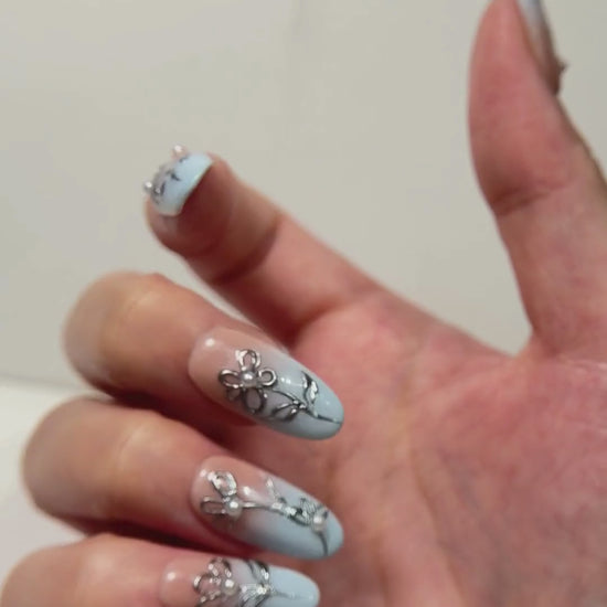 This handcrafted press-on nail set features a soft baby-blue gradient paired with delicate 3D floral accents for a dreamy, feminine look. Each nail is made using salon-grade soft gel for a natural, flexible, and reusable finish.