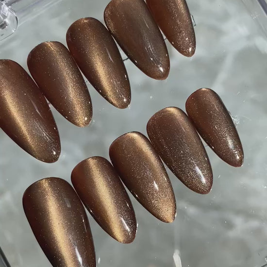 This set features a deep bronze-gold cat eye design with a reflective shimmer that shifts beautifully under light. The rich metallic finish gives the nails a warm, glowing look perfect for fall, winter, nights out, or anything that needs a touch of glam. The almond shape elongates the fingers and creates a clean, polished silhouette.