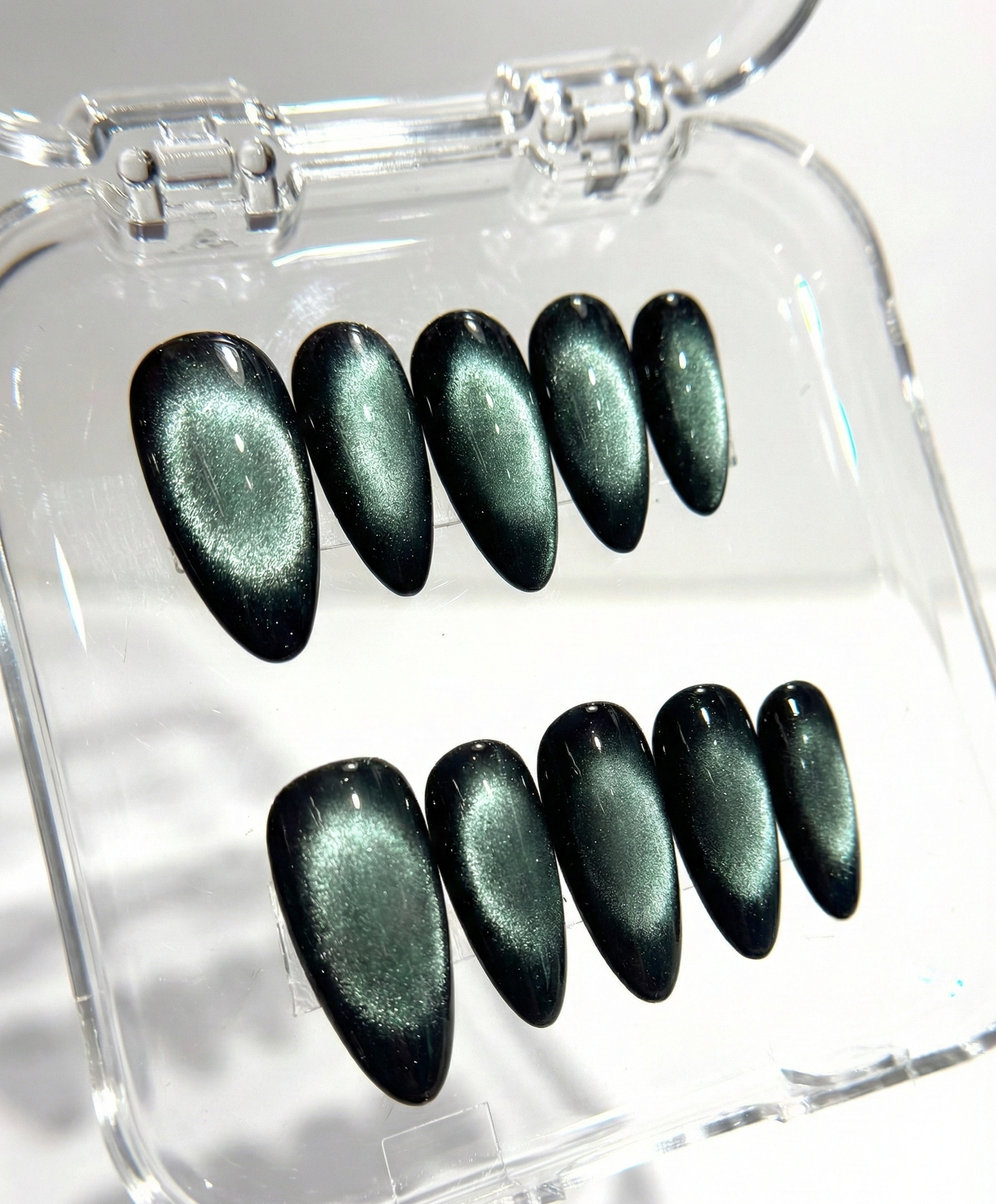 Captivate the room with the "Mystic Emerald" Cat Eye Set. This isn't just a nail color; it's a hypnotic experience. The design features a deep, rich forest green base that looks almost black in dim light, but reveals a stunning shimmering green magnetic streak when it catches the sun.