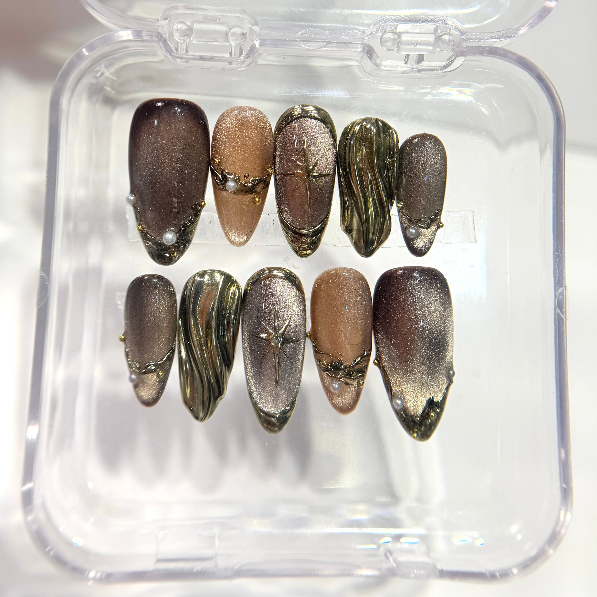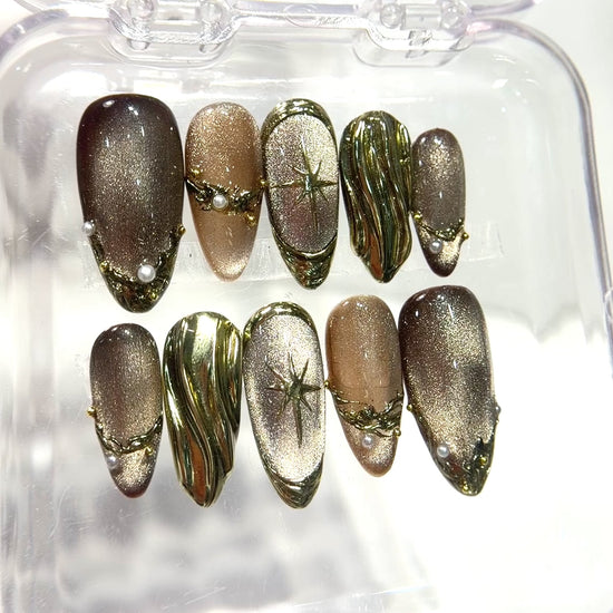 This luxurious set features a metallic brown cat-eye base paired with stunning 3D molten gold accents, vintage starburst charms, micro pearls, and sculpted liquid-gold textures. Every nail is handcrafted with premium builder gel to ensure durability, reusability, and a true salon finish.