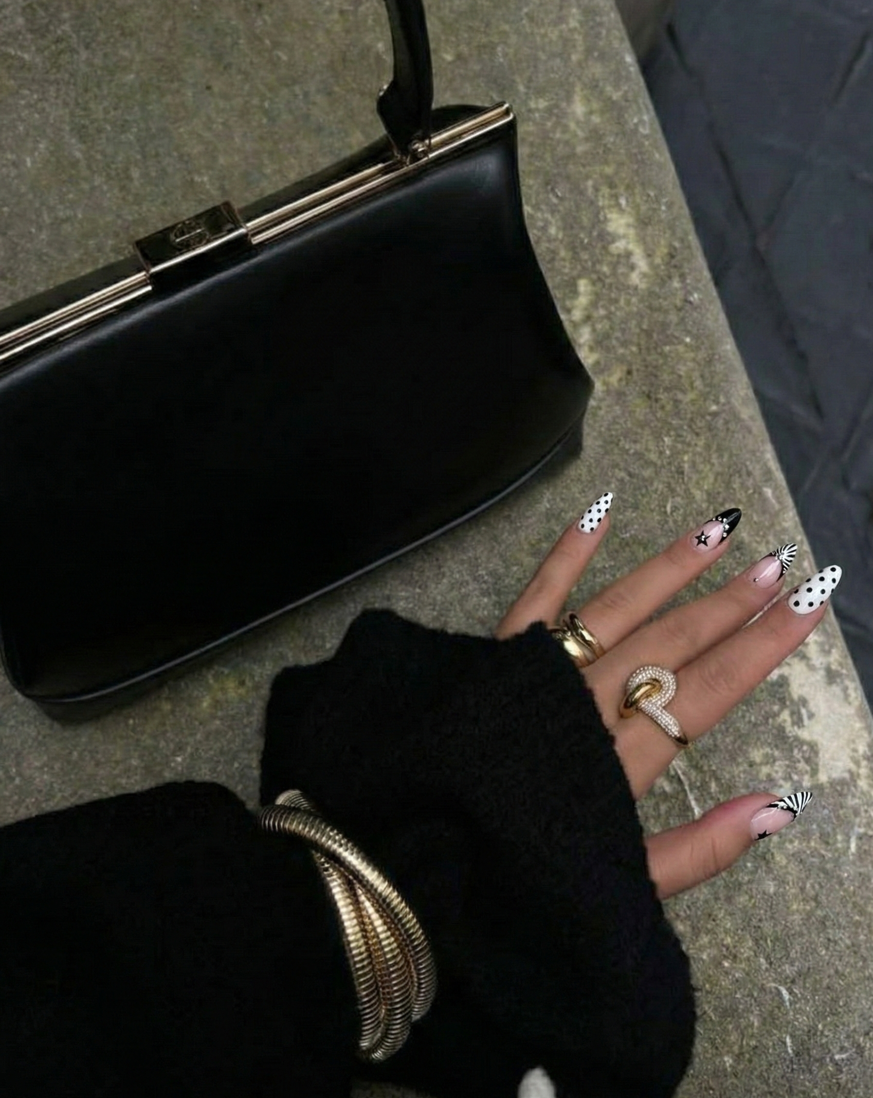 Mix Match Black & White Press On Nails - Zebra Print Star Polka Dot - Rhinestone French Tip - Y2K Pop Punk Emo - Custom Size Set - PN251199