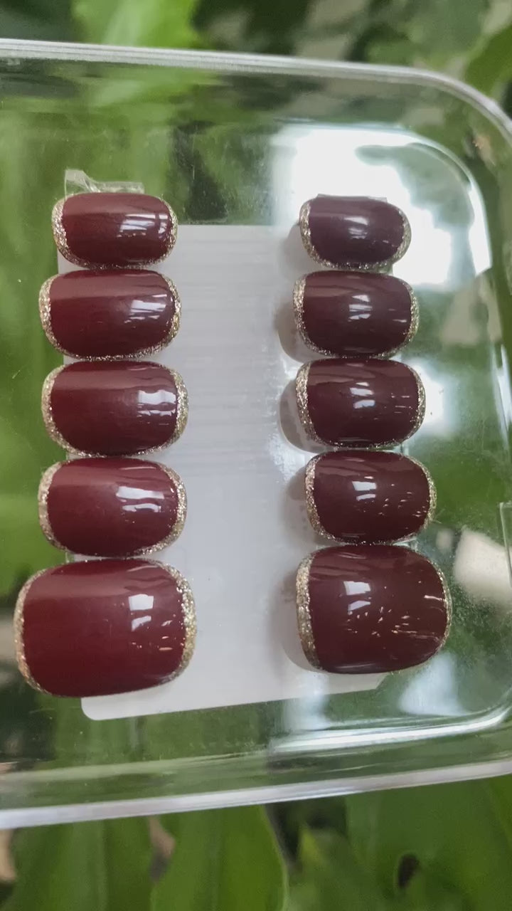 This set features a deep red burgundy base with a rich, glossy finish that catches the light beautifully. Each nail is outlined with a thin gold chrome rim, adding a luxurious and elegant touch without overpowering the classic color. The combination of burgundy and metallic gold gives the set a sophisticated, high-end look perfect for both everyday wear and special occasions.