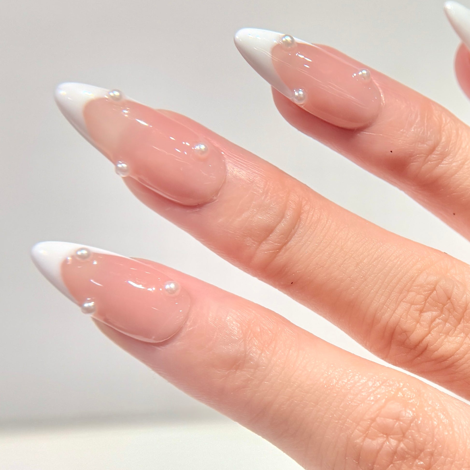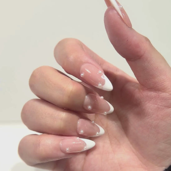 This set features a soft nude jelly base paired with crisp white almond French tips, finished with delicate 3D pearl droplets placed across each nail. The glossy, curved surface gives a “water droplet / glazed pearl” look that feels modern, minimal, and elegant.