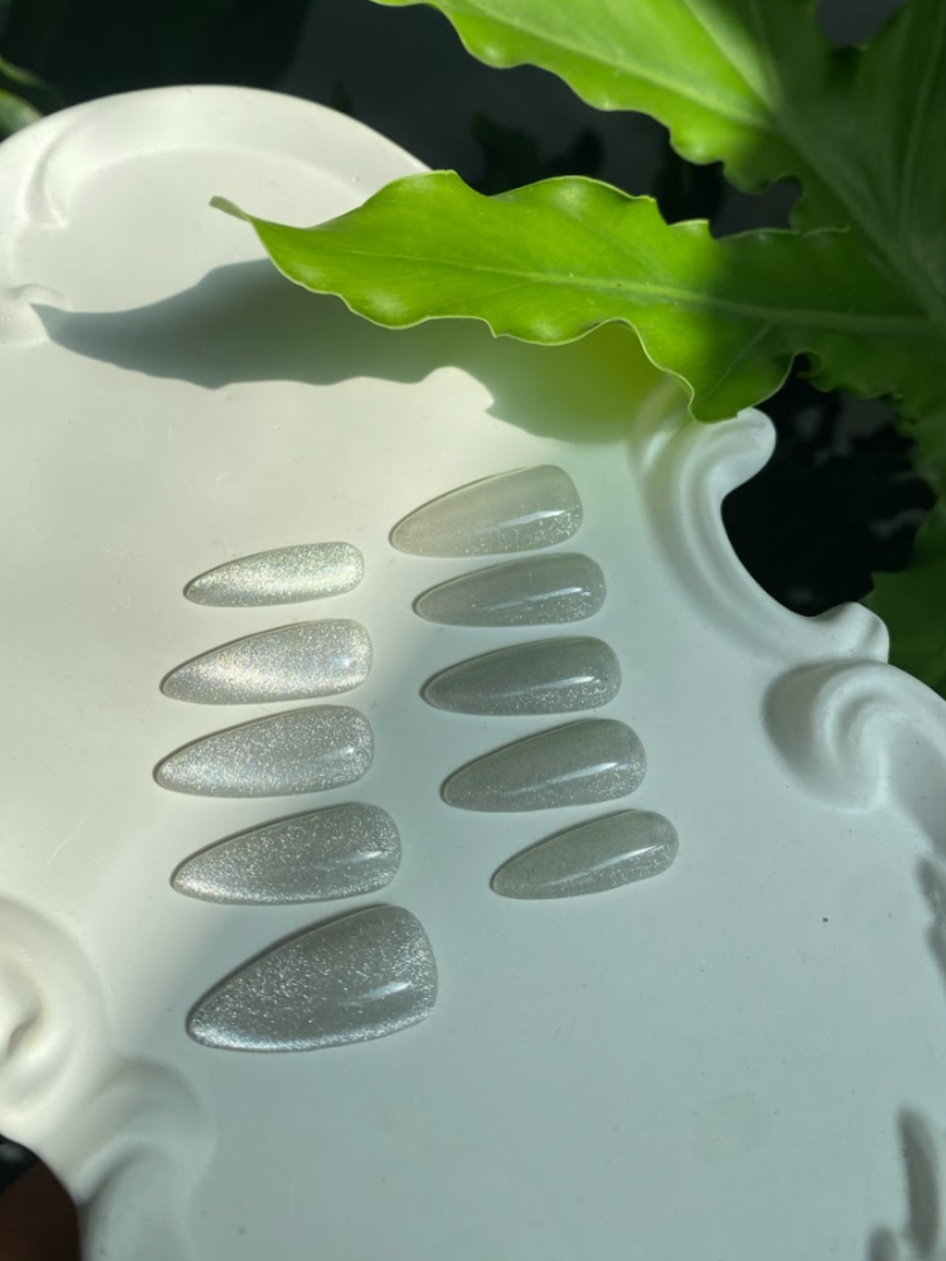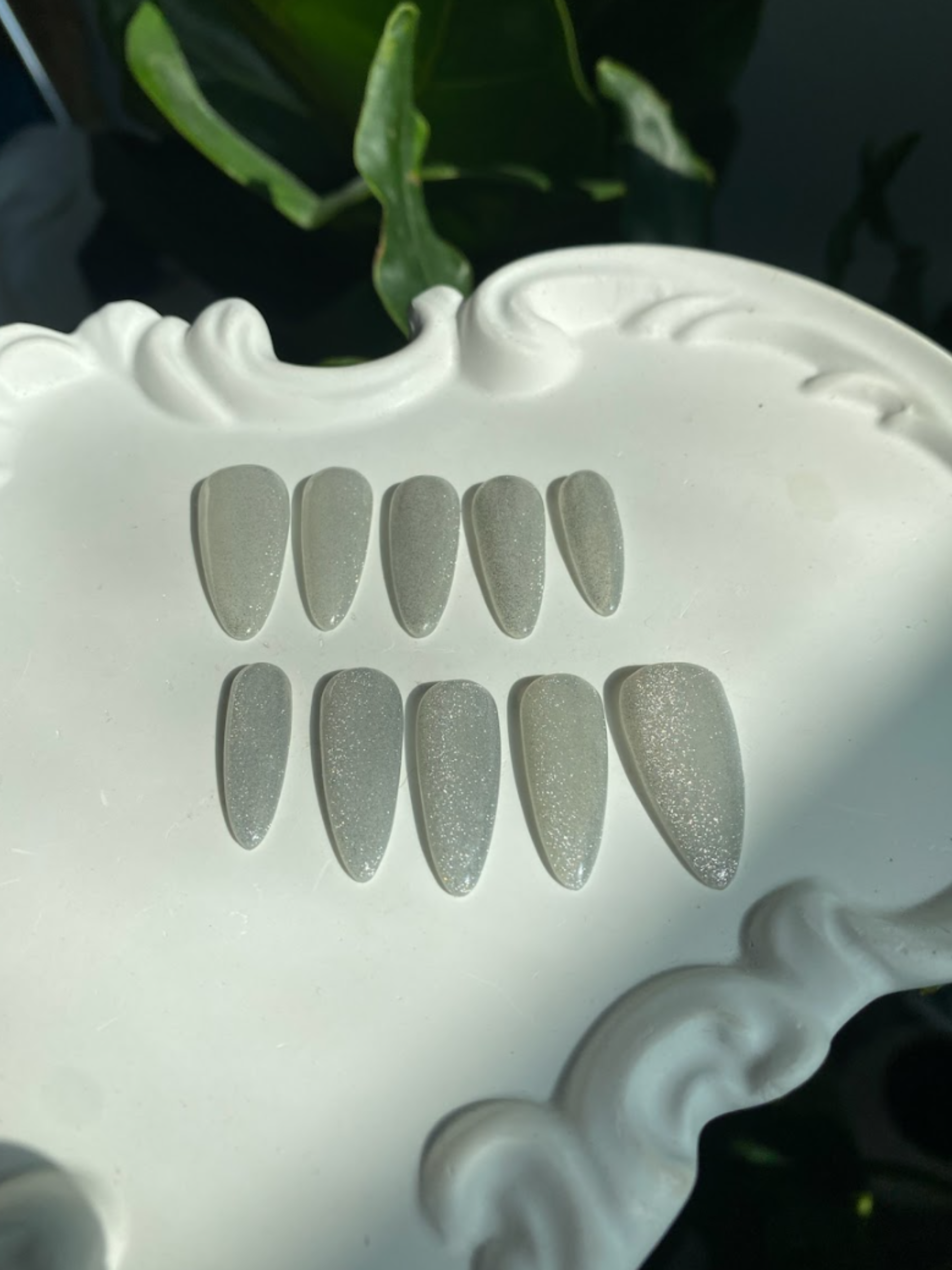 This set features a stunning silver cat-eye shimmer that sparkles beautifully under natural and indoor lighting. The effect shifts softly as you move your hand, giving the nails a luminous, reflective glow. The color is a cool-toned silver with fine glimmer that feels elegant, minimal, and effortlessly chic.