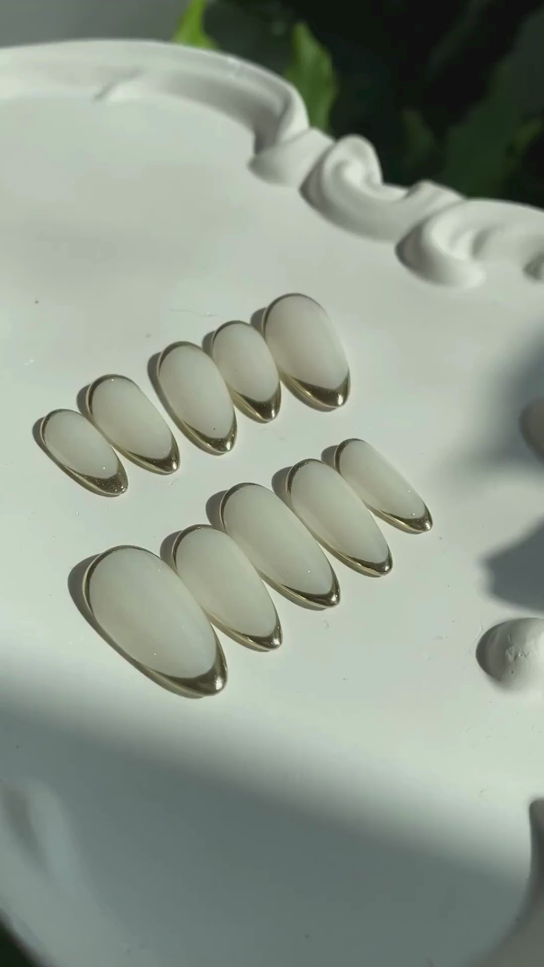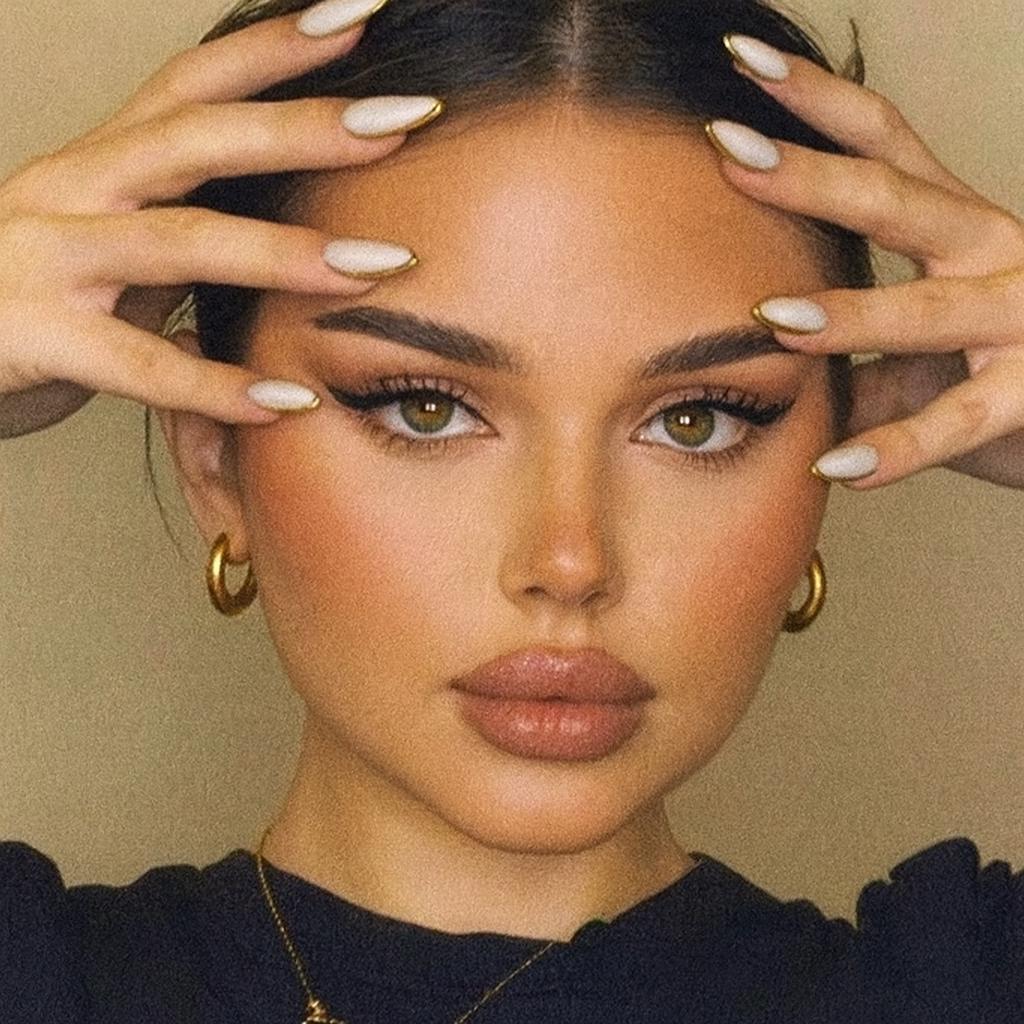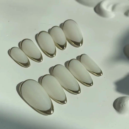 This set captures a refined, quiet luxury feel — a soft, glossy white almond nail framed with a delicate gold chrome outline. The gold edge adds a subtle, luminous glow that feels elegant and understated, giving a modern, minimalist twist to the classic French tip.